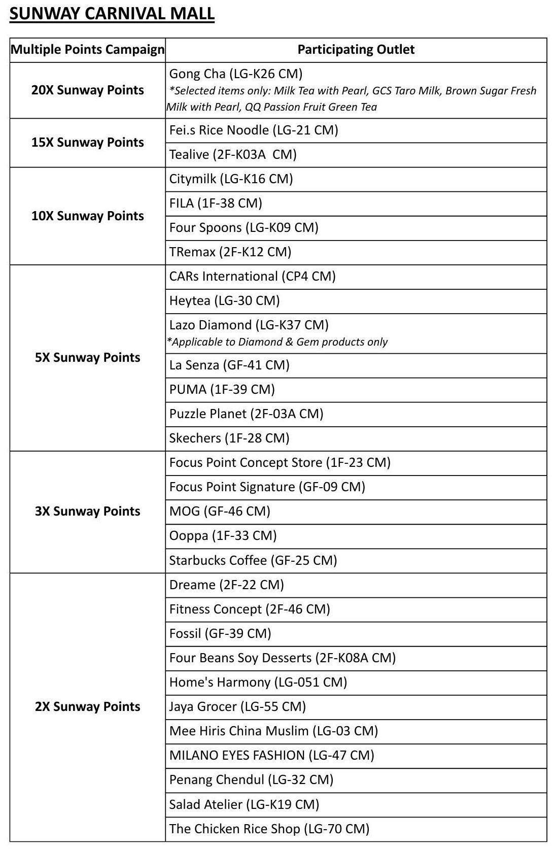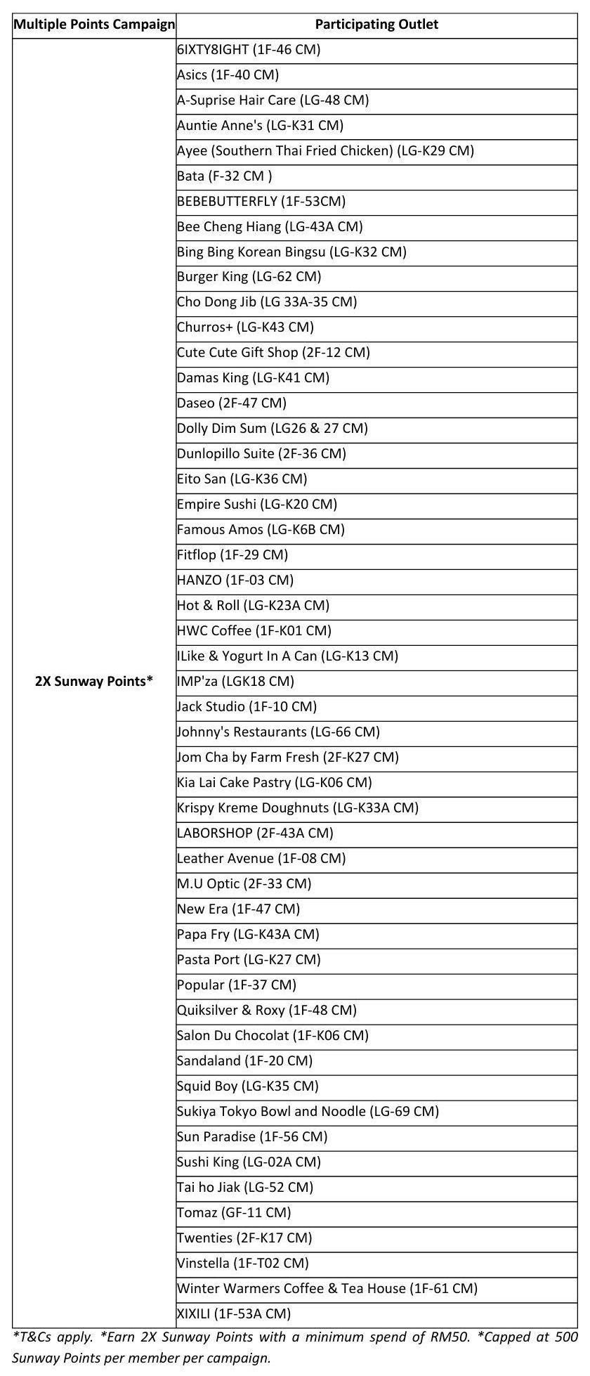 The 2X Sunway Points* reward is applicable only with a minimum spend of RM50, and capped at a maximum of 500 Sunway Points awarded to each member throughout the entire campaign or conclude once in total reaches 2,500,000 Sunway Points, whichever comes first.